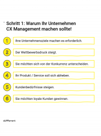 Let's continue with the W-questions. If the "why" can be answered clearly, we move on to the "where": Where does your organization currently stand with regard to your CXM objectives? What is already going well, where is there still room for improvement? Only those who know where he or she stands can run in the right direction. Detours cost time and, above all, nerves. That is why it is important to reflect carefully at this point and evaluate the current situation.